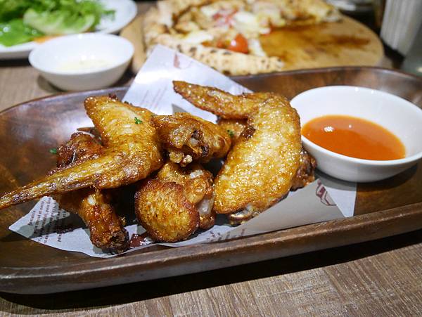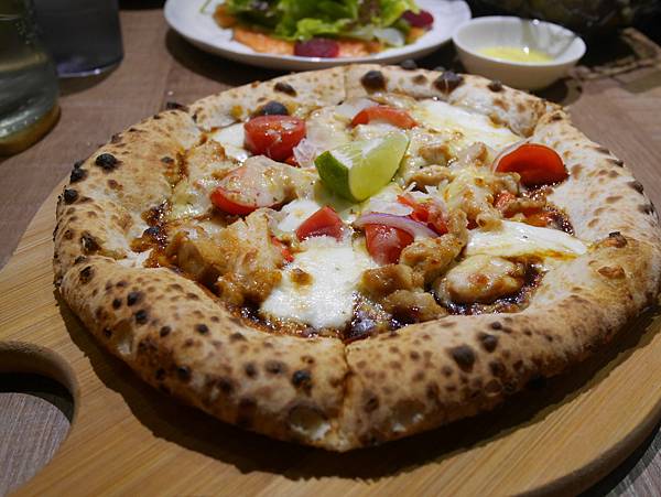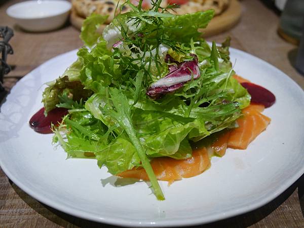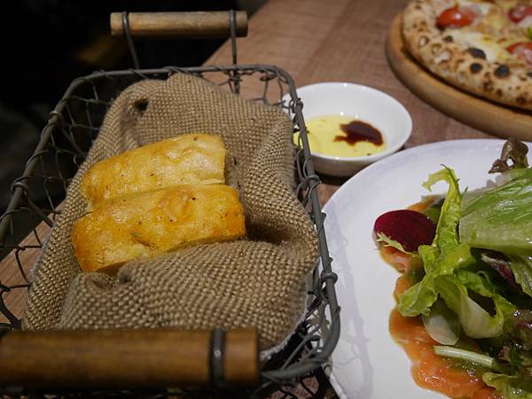 不到十分鐘後,桌上已擺滿招待的佛卡夏麵包、沙拉、PIZZA